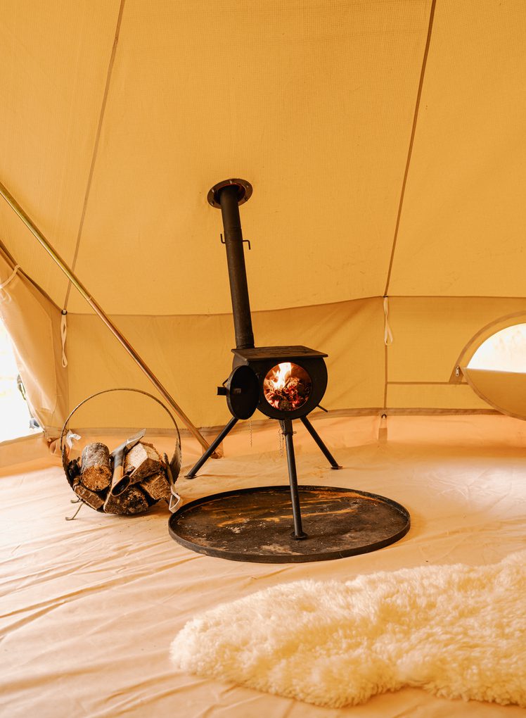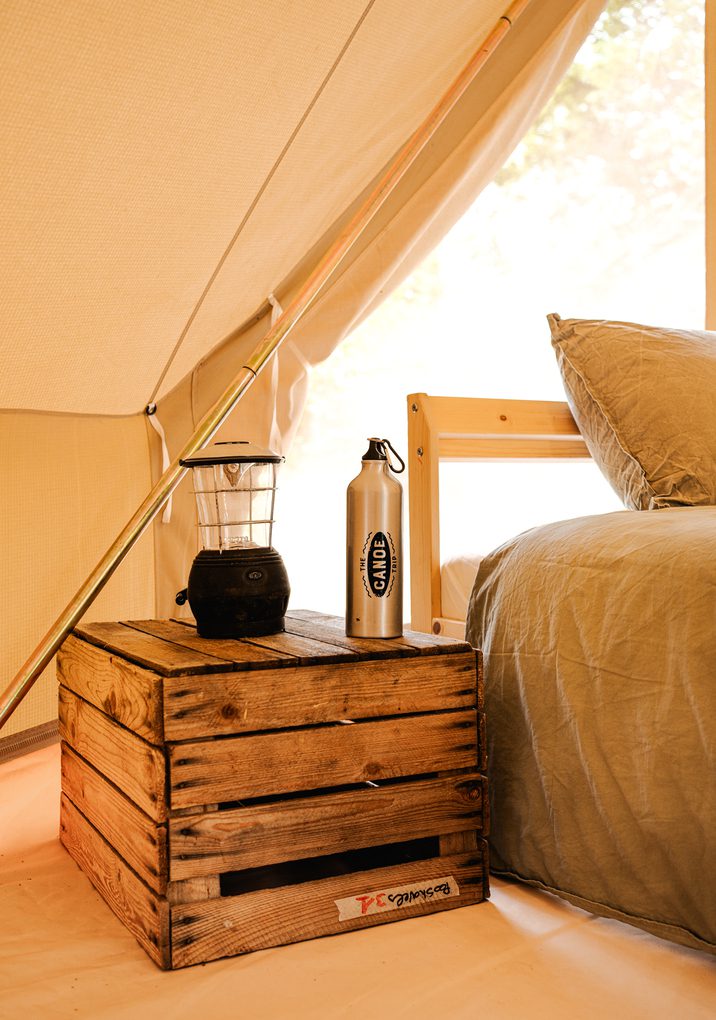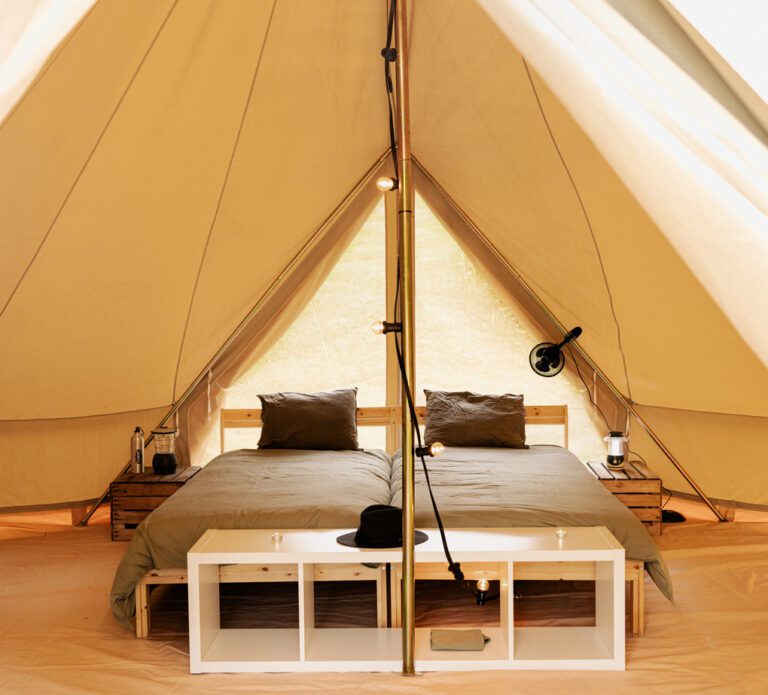• Our glamping tent offers a sheltered and thoughtfully arranged sleeping space.