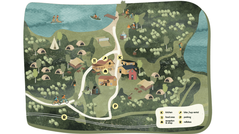 Plan your stay with confidence. This map highlights all the key areas of our lakeside campground — from generous tent and car-camp spots to community areas, access to water, and easy routes to nearby trails and paddling waters. Whether you’re here to unplug, paddle, bike, or simply lounge by the lake, this is your guide to feeling grounded in nature from the moment you arrive.