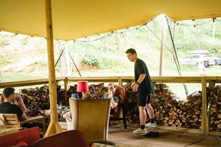 Group tent — A sheltered hub for movement sessions and slow evenings when the weather turns.