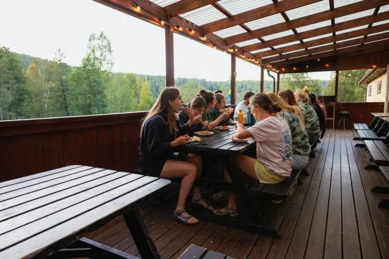 (Outdoor lounge) — A flexible, weatherproof hangout for coffee, planning routes, and meeting other guests. Here you’ll also find games, fire wood and in the evenings a bonfire.